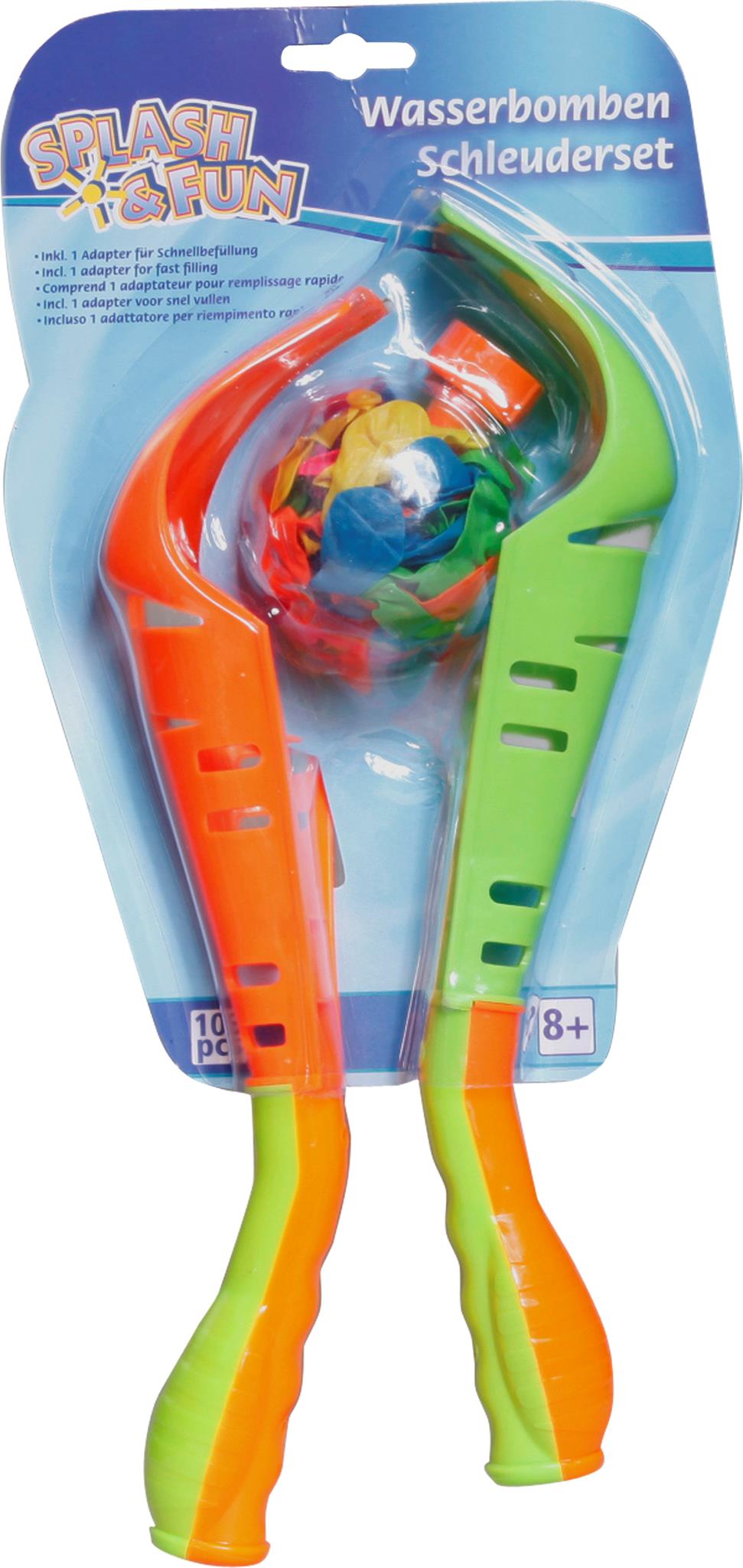 Splash und Fun Wasserbomben Schleuderset. Enthalten sind zwei Schleudern mit denen man die Wasserbomben über 15 Meter katapultieren kann und 100 Wasserbomben. Inklusive Adapter für den Wasseranschluss zum schnellen Befüllen der Ballons. Für Kinder ab 8 Jahren.