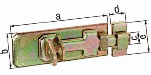 mit flachem Griff bei vorgeschobenem Schieber sind die versenkten Schraublöcher der Riegelplatte abgedeckt, so dass ein Abschrauben unmöglich ist · die Schlaufe ist durch eine Einschlaglasche gesichert, die durch den vorgeschobenen Schieber verdeckt wird · Material: Stahl, Oberfläche: galvanisch gelb verzinkt mit befestigter Schlaufe