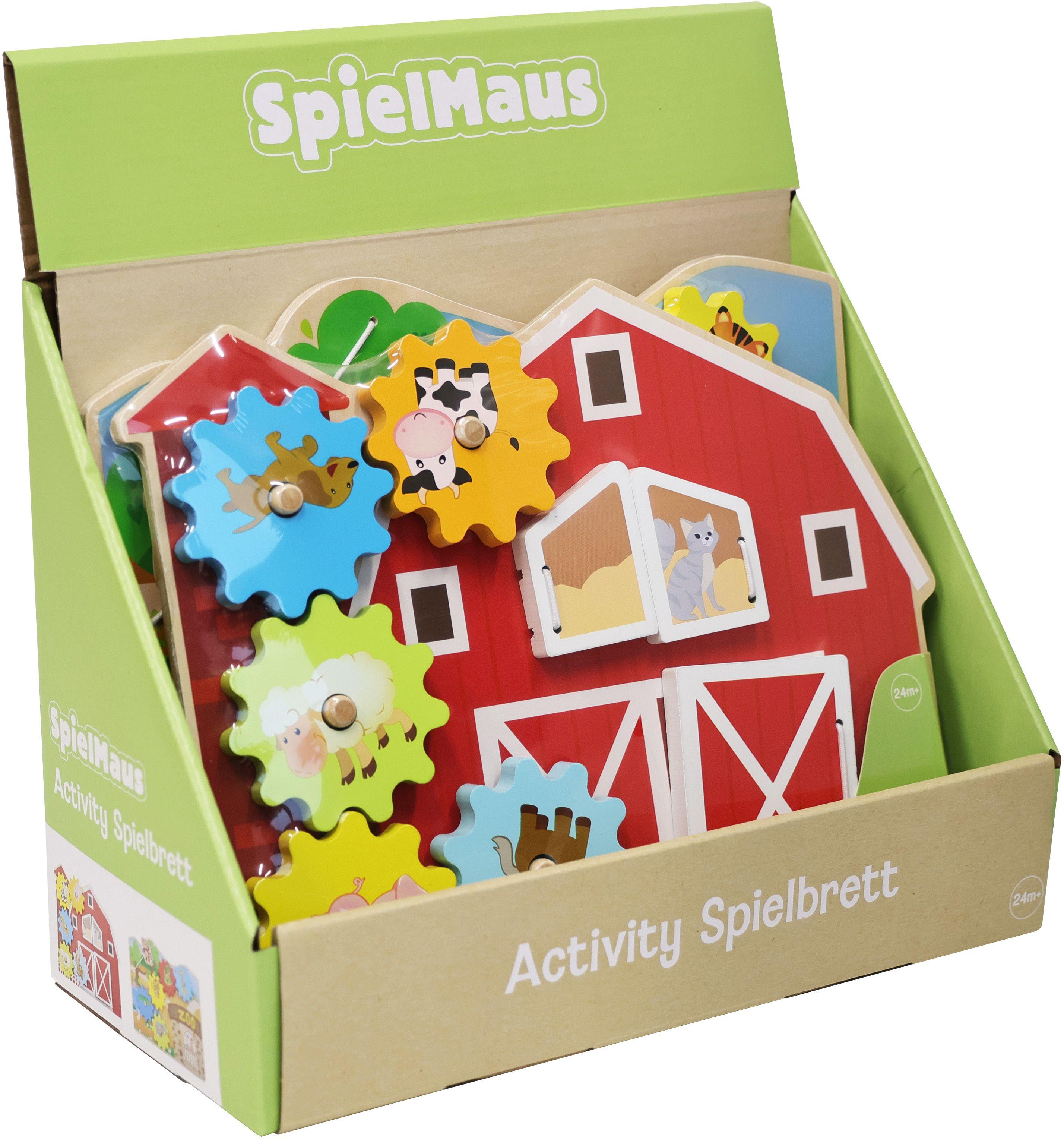 SpielMaus Holz Activity Spielbrett mit verschiedenen Rädchen zum Drehen und Stecken. Fenster und Türen die geöffnet und geschlossen werden können. In zwei verschiedenen Ausführungen. 6 Stück in einem Display. Maße ca. 28,1x22x2,5 cm. Für Kinder ab 12 Monaten.