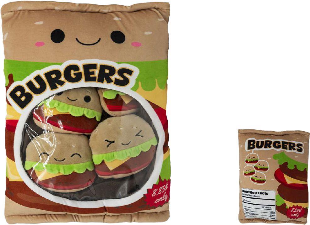 Flauschige Plüschtasche mit Klettverschluss, gefüllt mit super süßen und leckeren Burgern. Maße der Tasche ca. 40x30x7,5cm. Die Burger sind einzeln entnehmbar. Für Kinder ab 3 Jahren.