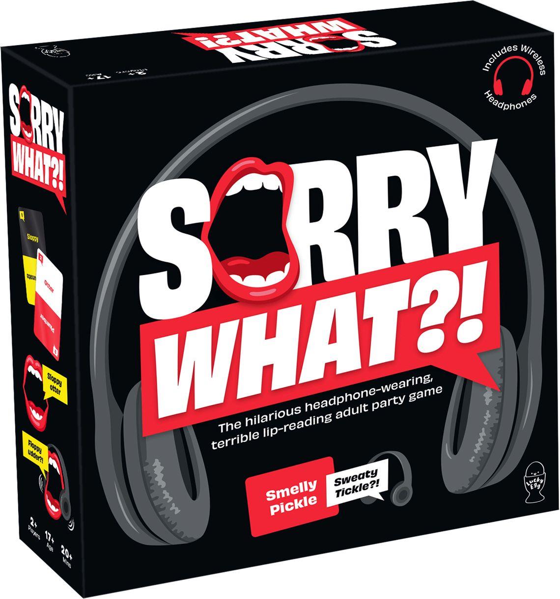 Lasst euren schmutzigen Gedanken freien Lauf in Sorry What?! – der ultimativen Lippenlese-Challenge, die stundenlangen Spaß mit zweideutigen Formulierungen garantiert! Tretet in einem prickelnden Duell an, bei dem zwei Teams absurde und anzügliche Sätze erraten müssen. Setzt die schalldichten Kopfhörer auf, versucht die Lippen eurer Teamkollegen zu lesen, die zwei Karten als Vorgabe haben und freut euch auf urkomische Fehlinterpretationen! Hat jemand gerade etwa „Kitzliger Retriever…? oder „Eingelegter Biber…? gesagt?