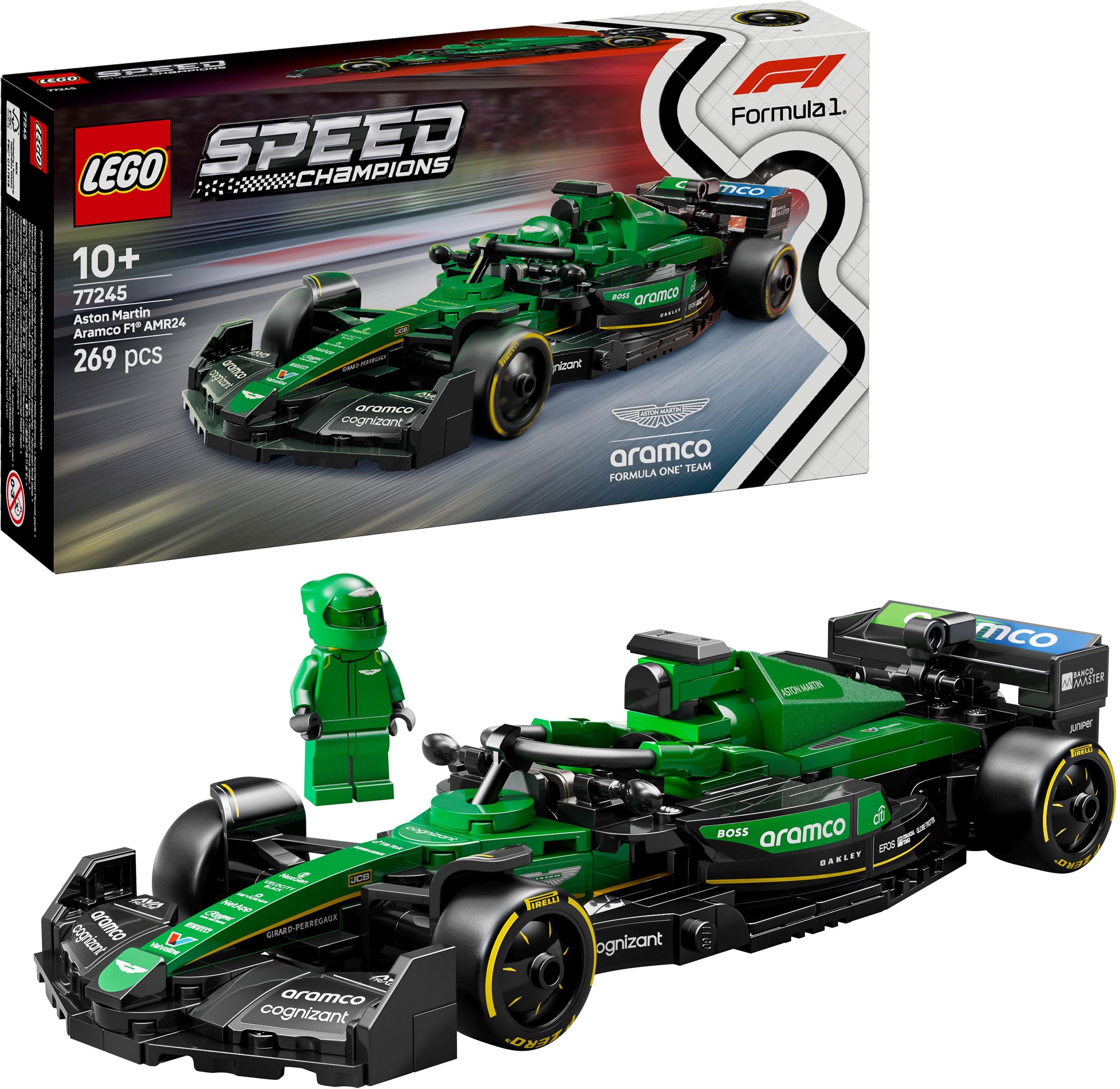 Das LEGO Speed Champions Aston Martin Aramco F1 AMR24 Rennauto (77245) aus diesem Fahrzeugset lässt Jungen und Mädchen ab 10 Jahren bauen, spielen und packende F1-Rennen austragen. Dieses Modell eines F1-Rennwagens für Kinder und erwachsene Fans vom Motorsport hat dieselben Designdetails wie der echte Flitzer, der um die Formel 1 Weltmeisterschaft 2024 mitgefahren ist. Das Aston Martin Spielzeug Auto hat ein Cockpit, das sich öffnen lässt, indem man den Halo-Bügel hochklappt, einen Heckflügel, einen Querlenker, Sponsorenaufkleber und breitere Hinterreifen mit dem Aufdruck „Pirelli. Das Bauspielzeug beinhaltet auch eine Rennfahrer Minifigur im Aston Martin Aramco-Rennoverall und mit Helm, die man fürs Rennen ins Cockpit setzen kann. LEGO Speed Champions Sets lassen Kinder und erwachsene Motorsportfans Modelle von einigen der legendärsten Flitzern der Welt bauen. Hierzu zählen auch noch andere separat erhältliche Modelle von Boliden, die in der Formel-1-Saison 2024 um den Titel mitgefahren sind. Jedes dieser Modellautos lässt sich mithilfe einer gedruckten Bauanleitung zusammenbauen. Oder du lässt dich und dein Kind von der LEGO Builder App auf ein vergnügliches Bauabenteuer mitnehmen. Das Aston Martin Aramco F1 AMR24 Rennauto ist 4 cm hoch, 20 cm lang und 7 cm breit. Enthält 269 Teile.