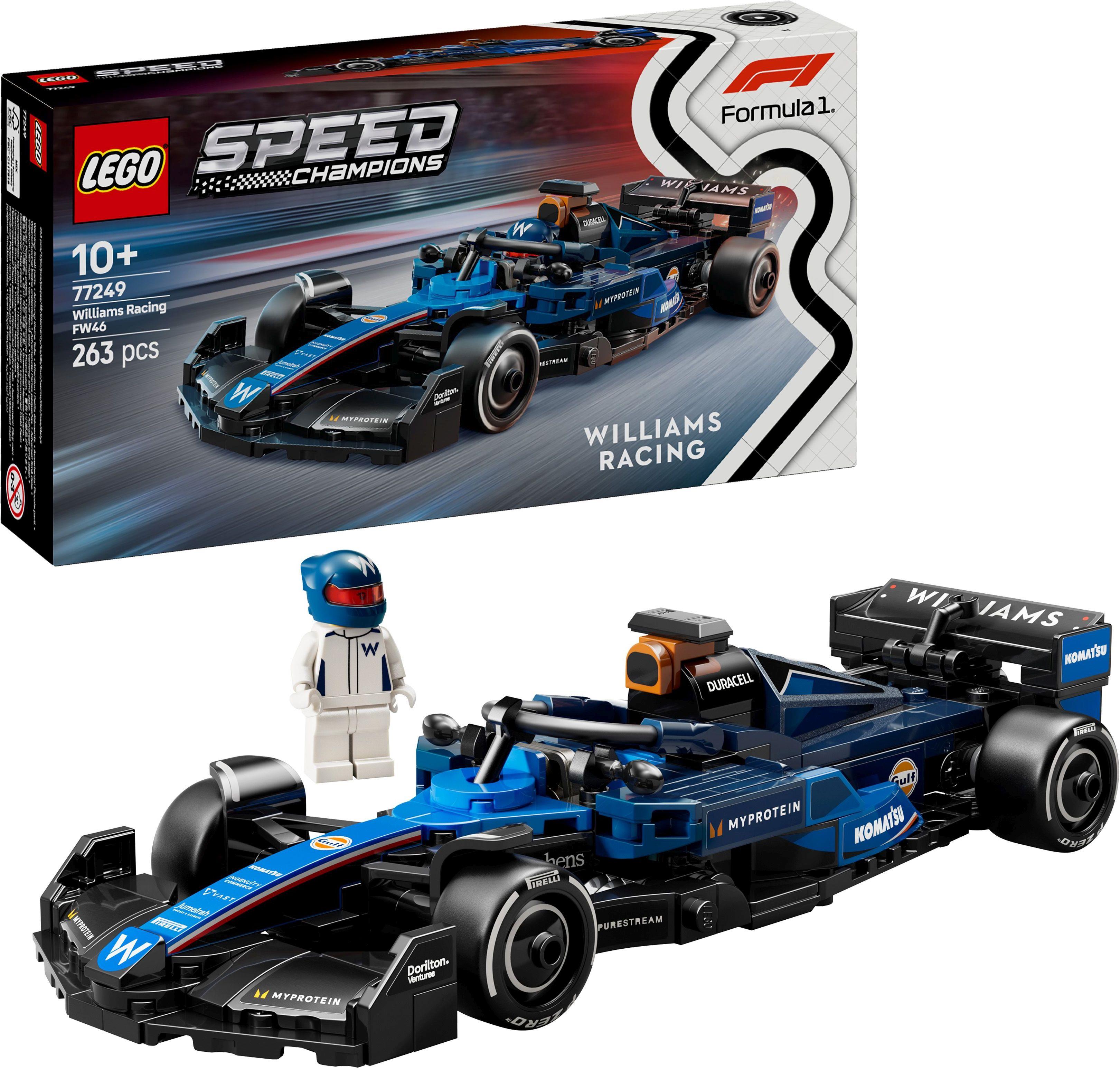 Mit dem LEGO Speed Champions Williams Racing FW46 F1 Rennauto (77429) erwartet Jungen und Mädchen ab 10 Jahren der Nervenkitzel superschneller Formel 1 Rennen. Kinder und erwachsene Fans können das Auto sammeln, bauen und ausstellen oder in spannende Rennen schicken. Das Modell hat dieselben Designdetails wie der echte Flitzer, der um die Formel 1 Weltmeisterschaft 2024 mitgefahren ist. Das Spielzeug Auto hat ein Cockpit, das sich öffnen lässt, indem man den Halo-Bügel hochklappt, einen Heckflügel, einen Querlenker, Sponsorenaufkleber und breitere Hinterreifen mit dem Aufdruck „Pirelli. Zu dem baubaren Rennwagen gehört auch eine Rennfahrer Minifigur mit Helm und im Rennoverall von Williams Racing, die man ins Cockpit setzen kann. LEGO Speed Champions Sets und Bauspielzeuge lassen Kinder und Motorsportfans Modelle von einigen der legendärsten Flitzern der Welt bauen. Hierzu zählen auch noch andere separat erhältliche Modelle von F1-Boliden, die in der Formel-1-Saison 2024 um den Titel mitgefahren sind. Jedes dieser Rennautos und LEGO Fahrzeuge lässt sich mithilfe einer gedruckten Bauanleitung zusammenbauen. Oder du lässt dich und dein Kind von der LEGO Builder App auf ein vergnügliches Bauabenteuer mitnehmen. Das Williams Racing F1 Rennauto ist 4 cm hoch, 20 cm lang und 8 cm breit. Enthält 263 Teile.