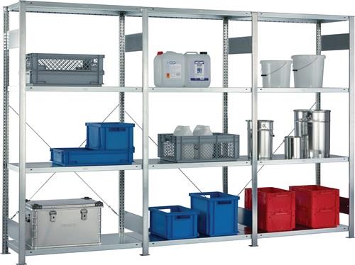 bestehend aus: 1 Grund- und 2 Anbauregalen mit jeweils 4 Fachböden · verzinkt · Modulbauweise · schnelle Steckmontage · Fachböden im 25-mm-Raster höhenverstellbar · T-Profilrahmen mit vormontierten Verbindungsblechen · 150 kg Tragfähigkeit je Boden (bei gleichmäßig verteilter Last), Feldlast 1650 kgGrundregal: Nennlänge + 56 mm Nenntiefe + 36 mmAnbauregal: Nennlänge + 6 mm Nenntiefe + 36 mm