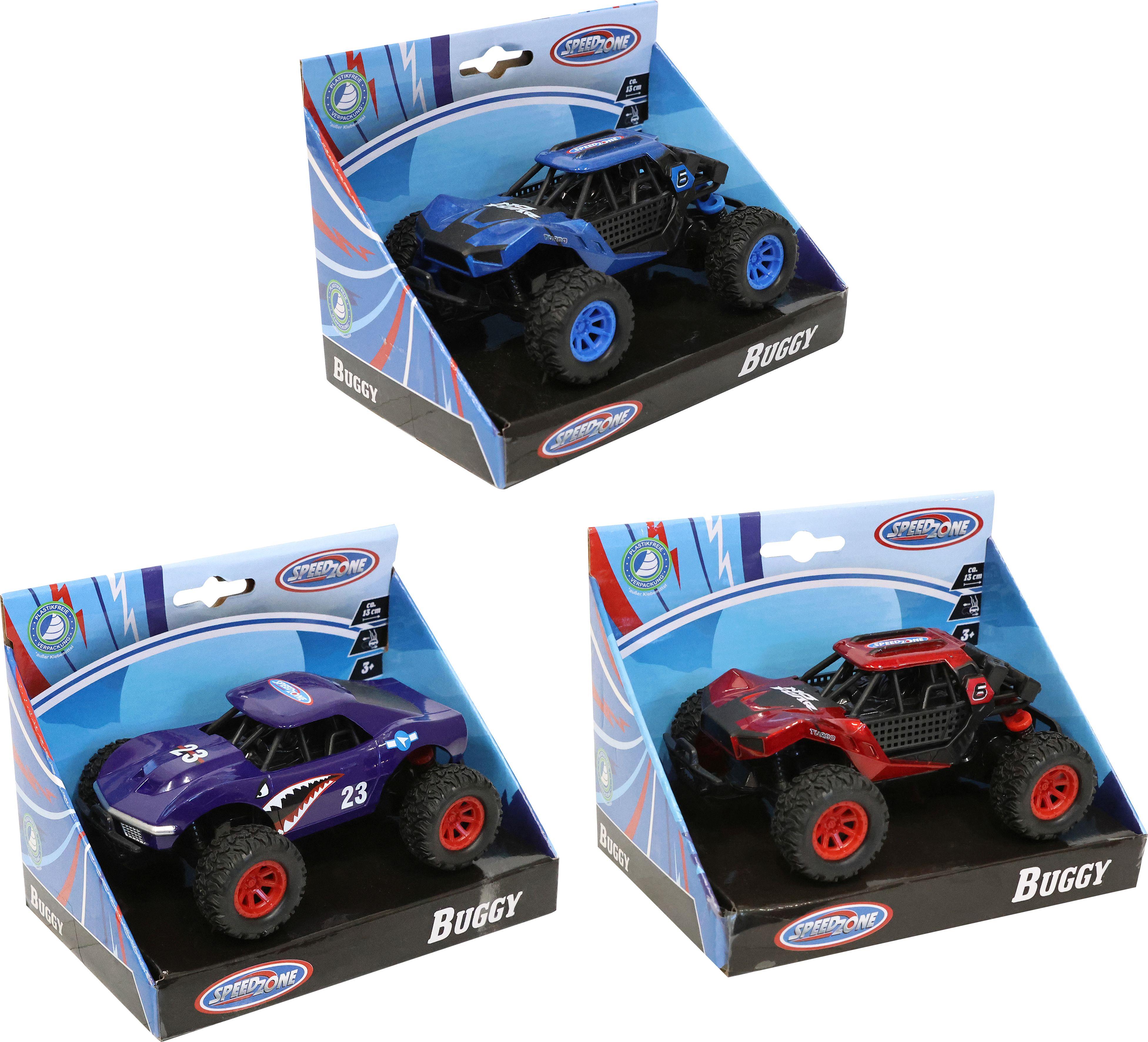 Speedzone D/C Buggy, 3-fach sortiert. Mit Rückzug und Federung. Länge ca. 13 cm. Für Kinder ab 3 Jahren.
