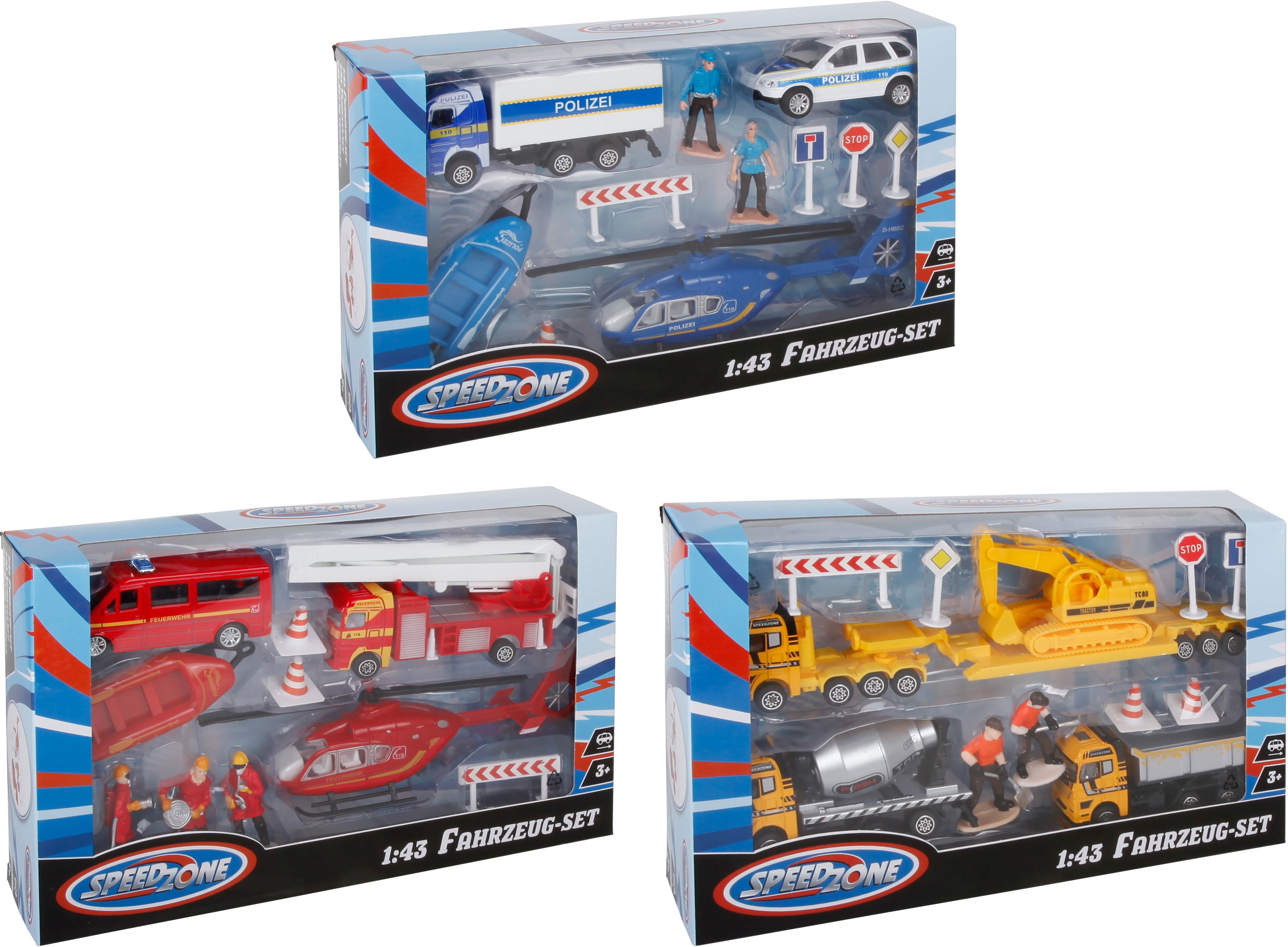 Speedzone D/C Spielset Servicefahrzeuge, mit Freilauf. Maßstab 1:43 und 1:60, 3-fach sortiert. Für Kinder ab 3 Jahren.