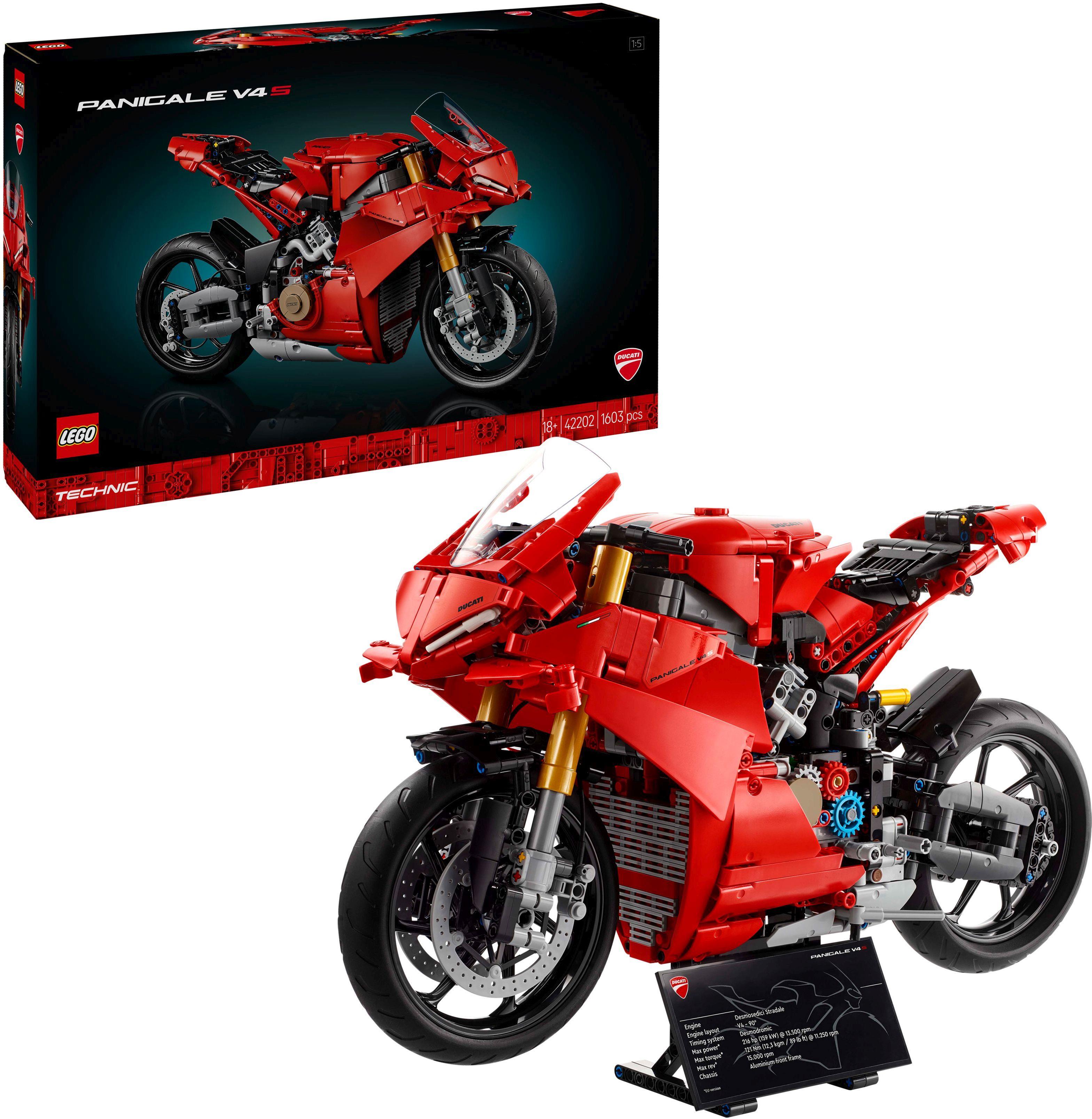 Das LEGO Technic Ducati Panigale V4 S Motorrad (42202) aus diesem Bauset für Erwachsene bringt deine Abenteuerlust auf Hochtouren. Dank der imposanten Details und der authentischen Funktionen ist dieses Modell eine tolle Hommage an die echte Ducati Panigale V4 S – das leistungsstärkste und schnellste Rennmotorrad aus dem Ducati-Stall. Erkunde die Vorder- und Hinterradaufhängung sowie die Lenkung an diesem Motorradmodell. Schau dir das Schaltpedal und das Schaltgetriebe (3 Gänge und Neutral) an. Dreh das Hinterrad, um die Kette anzutreiben, die das Schaltgetriebe mit dem V4-Motor verbindet. Die Lackierung im legendären Ducati-Rot macht dieses Fahrzeug zur perfekten Geschenkidee für Motorradfans. Auf dem beiliegenden Ständer wird das Superbike zu einem spektakulären Hingucker. Die Kollektion der LEGO Technic Fahrzeuge für Erwachsene lässt dich deine Begeisterung für superleistungsstarke Flitzer voll ausleben und bietet dir zugleich ein entspannendes Bauerlebnis. Eine Bauanleitung liegt dem Set bei. Eine digitale Version dieser Bauanleitung ist außerdem in der LEGO Builder App verfügbar. Das LEGO Motorrad ist 30 cm hoch, 43 cm lang und 15 cm breit. Enthält 1.603 Teile.
