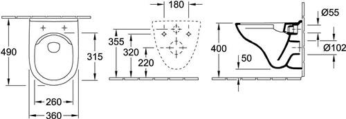 Einzel-Kartonverpackung · bestehend aus: Wand-WC tief Compact DirectFlush 5688 R0 XX · Abgang waagerecht · WC-Sitz mit QuickRelease und SoftClosing Funktion · Scharniere aus Edelstahl 9M38 S1 01 · 360 x 490 mm