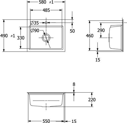 Villeroy & Boch Subway Style Flat · Subway Style 60 S Flat · Maße: 580 x 490 mm · flächenbündige Spüle · Spüle inklusive Ablaufgarnitur · Rund mit Handbetätigung und Abtropfgitter · Eckig · Die Spüle ist nicht reversibel · Minimale Unterschrankbreite: 60 cm · KR C