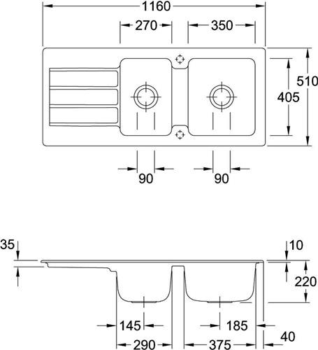 für den aufliegenden Einbau · reversibel · inkl. Ablaufgarnitur verchromt · minimale Unterschrankbreite 800 mm · 2 Becken verschließbar · 2 vorgestochene Hahnlöcher · CeramicPlus