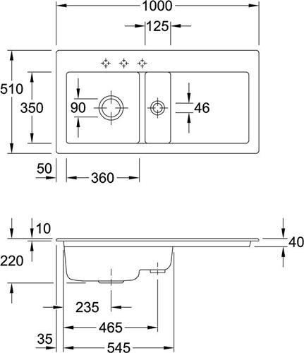 für den aufliegenden Einbau · inkl. Ablaufgarnitur · minimale Unterschrankbreite 600 mm · 3 vorgestochene Hahnlöcher · CeramicPlus