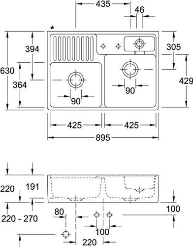 Montage auf einem Unterschrank oder wanhängenden Konsolen · inkl. Resteschale glasklar · Ablaufgarnitur verchromt und Befestigungsset für Montage auf einem Unterschrank · minimale Unterschrankbreite 900 mm · 2 Becken verschließbar · 2 vorgestochene Hahnlöcher · CeramicPlus