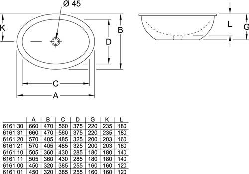 Außenseite glasiert · ohne Hahnlochbank · inkl. Befestigung · der Ausschnitt der Waschtischplatte kann nur anhand des Originalwaschtisches vorgenommen werden