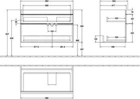 wandhängend · inkl. Befestigungssatz · Ausstattung: 2x Auszüge mit Antirutsch-Matte · 3x Accessory Boxen 9/10 · 1x hohe Glasabtrennung · 2x niedrige Glasabtrennungen · kombinierbar mit Schrankwaschtisch Venticello (Becken rechts) 4134 R1/R2/R3