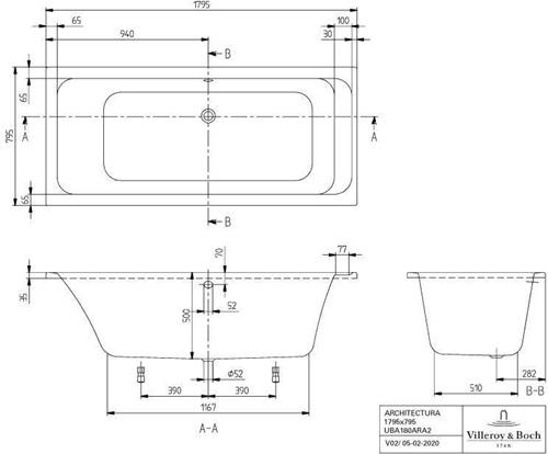 V&B Whirlpoolsystem ARCHITECTURA m BW R-eck 180x80 Tech. Pos 1 we