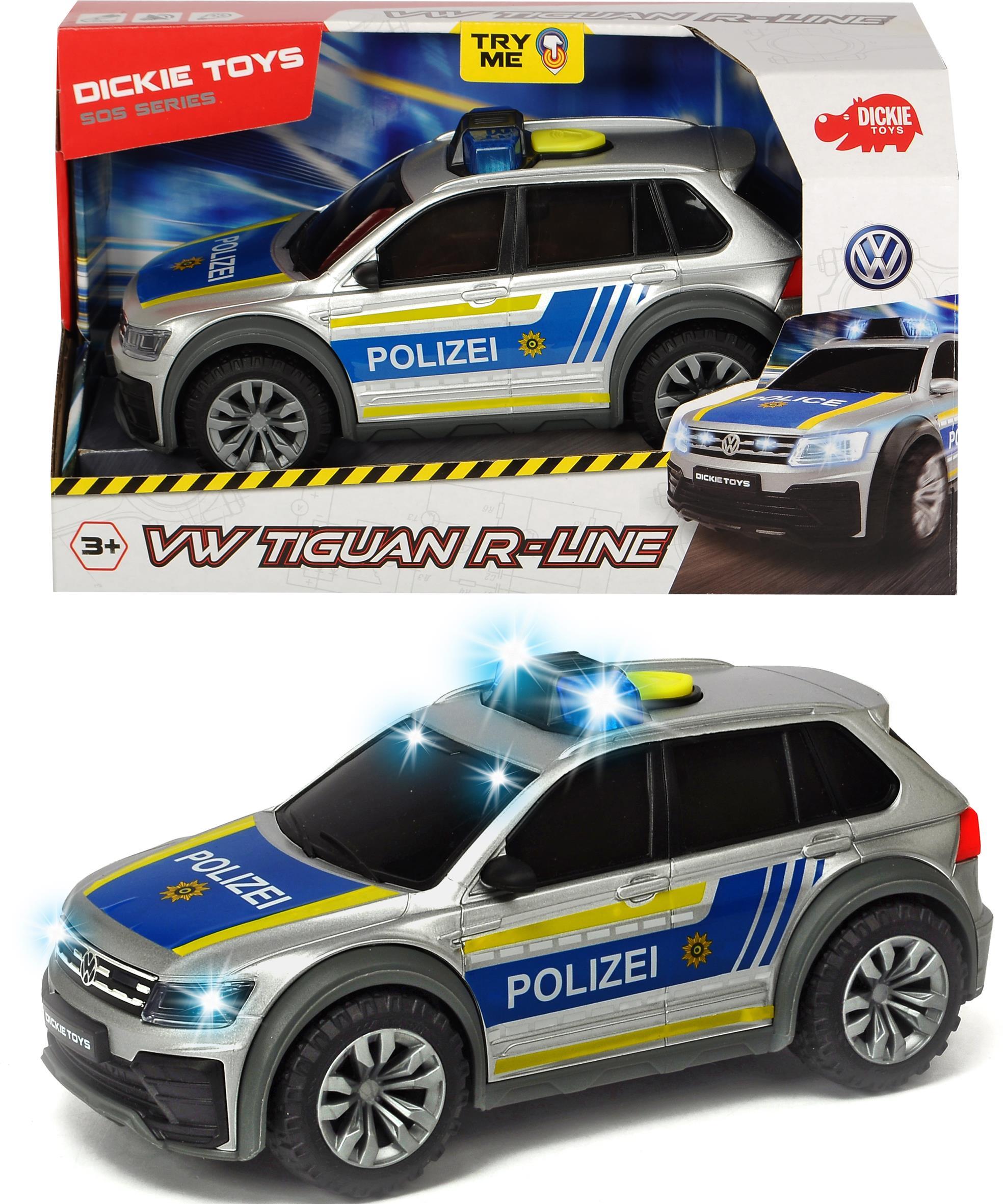 VW Tiguan R-Line Polizei: kraftvoller Einsatz-SUV Dickie Toys gibt bekannten Fahrzeugmodellen ein neues Gesicht. Der VW Tiguan R-Line Polizei in deutscher Version wurde dem großen Vorbild mit viel Detailliebe nachempfunden und für den Einsatz im Kinderzimmer ausgestattet. Das Spielzeugauto mit Freilauf im Maßstab 1:18 verbreitet auf Knopfdruck stilechte Licht- und Soundeffekte. Die notwendigen Batterien sind bereits enthalten. Der VW Tiguan R-Line Polizei ist der perfekte Sammeltipp für junge Autofans ab drei Jahren. Originalbez.: VW Tiguan R-Line Polizei Spielzeugauto mit Freilauf Modell: VW Tiguan R-Line in deutscher Polizeioptik Licht und Sound Batterien enthalten Maßstab 1:18 Länge: 25 cm Altersempfehlung: ab 3 Jahren