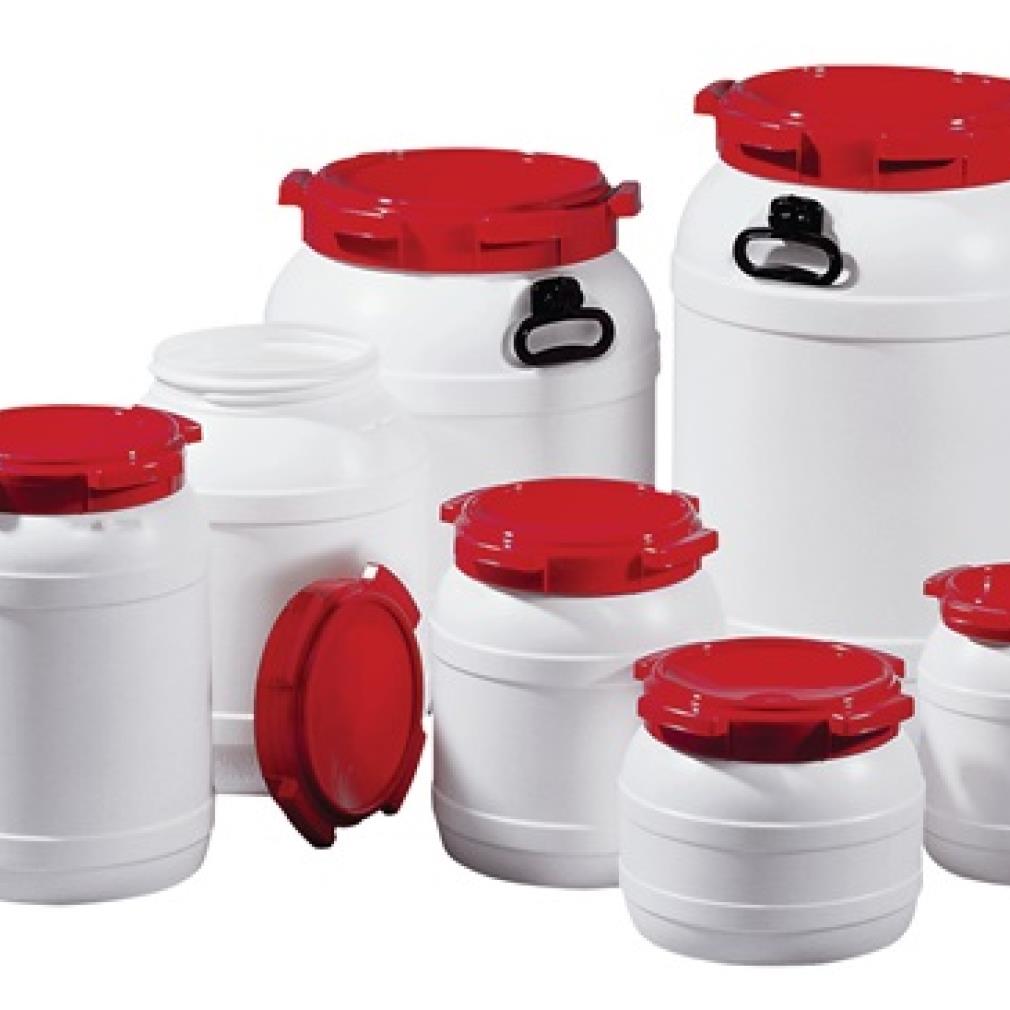 weiß mit rotem Deckel · mit Schraubverschluss · stabile Kunststoffgebinde ohne Metallbestandteile · stapelbar · UN-X-Zertifizierung für Feststoffe · luft- und wasserdicht · orginalitätssicher zu verplomben, lebensmittelrechtliche Unbedenklichkeit · max. Fülltemperatur bis 70 °C · der Inhalt muss auf 30 °C abgekühlt sein, bevor man das Fass schließen und stapeln kann
