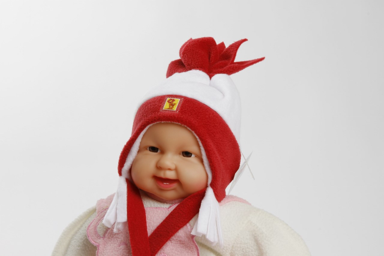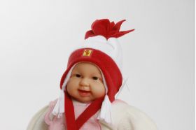 Kuschlig warme Mütze aus Polarfleece. Mit ihrer auffälligen rot/weiß Kombination und dem rot gefransten Bommel kommt sie bei den Kids immer gut an.