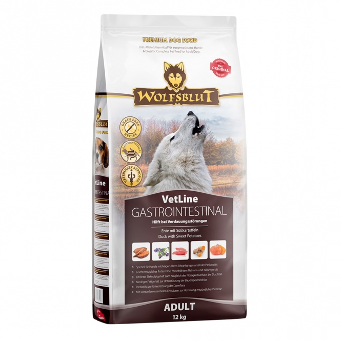 Wolfsblut VetLine GASTROINTESTINAL ist ein Diät-Alleinfuttermittel für ausgewachsene Hunde zur Linderung von Resorptionsstörungen des Darms, zum Ausgleich unzureichender Verdauung oder bei chronischer Insuffizienz der Bauchspeicheldrüse (Pankreatitis). Leidet ein Hund unter Durchfall und Erbrechen können unterschiedliche Ursachen in Frage kommen. Meistens sind Ernährungsumstellungen, eine gestörte Darmflora, Parasiten, Pilze oder aber Erkrankungen von Magen, Darm oder Bauchspeicheldrüse verantwortlich. Hält der Durchfall und das Erbrechen mehrere Tage an, gehen wichtige Mineralstoffe verloren und der Körper fällt in einen Mangelzustand. Im Fall einer Resorptionsstörung hat der Hund durch zum Beispiel eine Entzündung der Darmhaut, Schwierigkeiten das Futtermittel adäquat zu verdauen. Wolfsblut VetLine Gastrointestinal ist ein Diät-Alleinfuttermittel, das an die Bedürfnisses Ihres Hundes bei unzureichender Verdauung und gestörter Pankreasfunktion angepasst ist. Das Diätfutter enthält leicht verdauliches Entenfleisch, wodurch Magen und Darm entlastet werden. Durch den niedrigen Fettgehalt kann es auch bei einer Pankreasinsuffizienz verwendet werden. Mannan-Oligosaccharide (MOS) stabilisieren die Darmbarriere, eine regelmäßige Zufuhr von MOS trägt dazu bei, die bakterielle Besiedelung des Darms im Gleichgewicht zu halten. Da Dehydration eine Nebenerscheinung von Durchfall und Erbrechen ist, helfen die im Futter enthaltenen Elektrolyte dem Tier die fehlenden Mineralstoffe aufzunehmen. Die enthaltenen Prebiotika helfen dabei, die natürliche Darmflora und damit besonders die Verdauung im Dickdarm zu stärken. Zusätzlich hilft eine gesunde Darmflora dem Hund dabei zukünftige Magen-Darm-Infekte besser abzuwehren. Essenzielle Fettsäuren hemmen Entzündungsreaktionen und unterstützen dadurch die Funktion der Bauchspeicheldrüse. Die leckere Rezeptur aus Ente und Süßkartoffeln fördert die Futteraufnahme und sichert die Nährstoffversorgung. Aufgrund seiner entzündungshemmenden, Darmflora stärkenden Wirkung und dem niedrgen Fettgehalt kann das Futter helfen die Symptome einer Pankreatitis oder Magen-Darm-Erkrankung zu lindern.