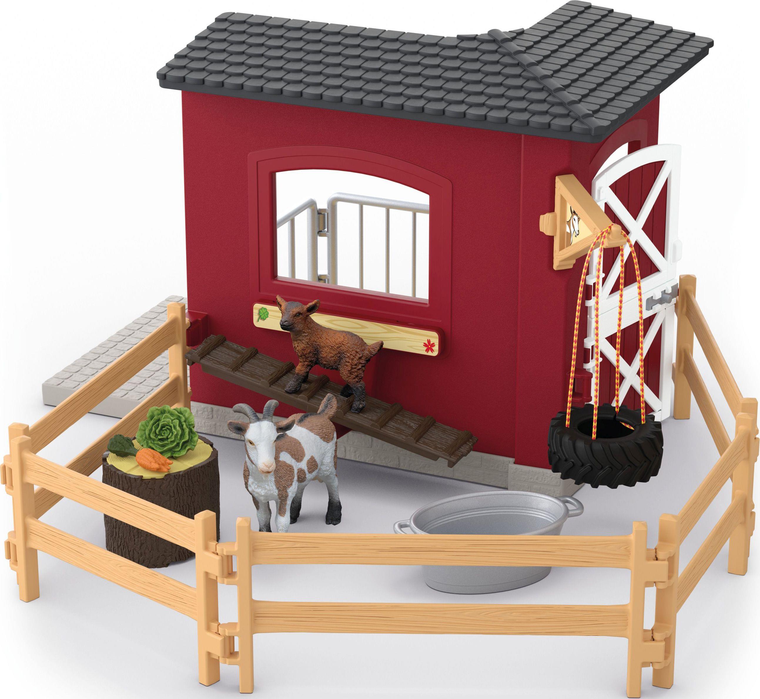Die Ziege stößt ein begeistertes Meckern aus: Gerade gab es frischen Salat und knackige Möhren. Lecker – beides fressen sie und ihr süßes Zicklein besonders gern. Schnell verlassen sie ihr gemütliches Strohlager im Ziegenstall und gehen zur Futterstelle. Die Wanne ist schon mit frischem Wasser gefüllt. Die Ziege beginnt sofort zu frühstücken. Das Zicklein will nichts fressen. Es hat die Wippe und den Reifen entdeckt. Da will es viel lieber spielen und seine Kletterkünste unter Beweis stellen. Das Frühstück kann warten!
